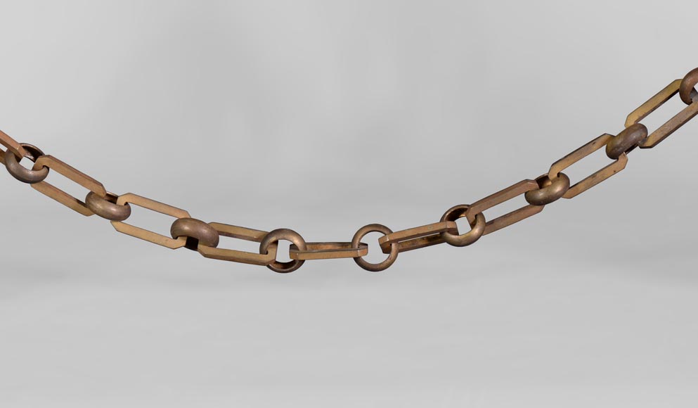 Эти дровницы в стиле Ампир были изготовлены в 19 веке. На каждой дровнице восседает красивая женщина-сфинкс, выполненная из бронзы с коричневой патиной. Подставка украшена лирой и розетками. Дровницы соединены цепочкой.