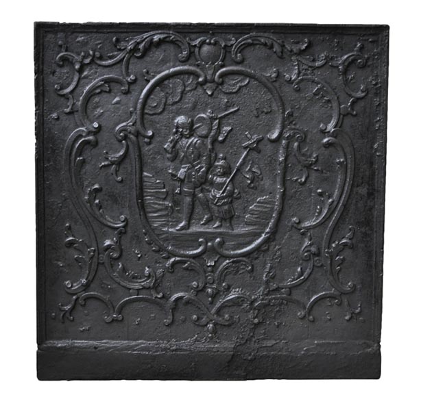 Эта старинная квадратная каминная плита была изготовлена в 18 веке. В обрамлении орнаментов в стиле Рокайль представлены два охотника, облачённые в восточные одежды.
